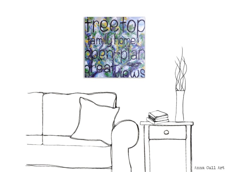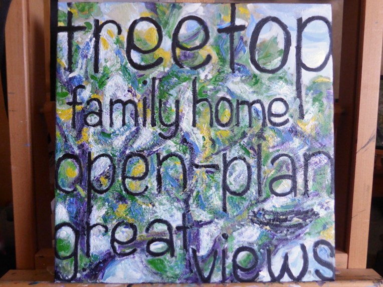 My latest six-word painting is more ‘rough art’ rather than fine art. It has lots of texture and touches of iridescent white and shiny gold (which aren’t really showing up in the photos). The nest wasn’t part of the original concept but just sort of appeared while I was working on the composition. Painting this reminded me that when I was very young, I wanted to sleep in the branches of our walnut tree, underneath the stars. Who am I kidding? I still do.