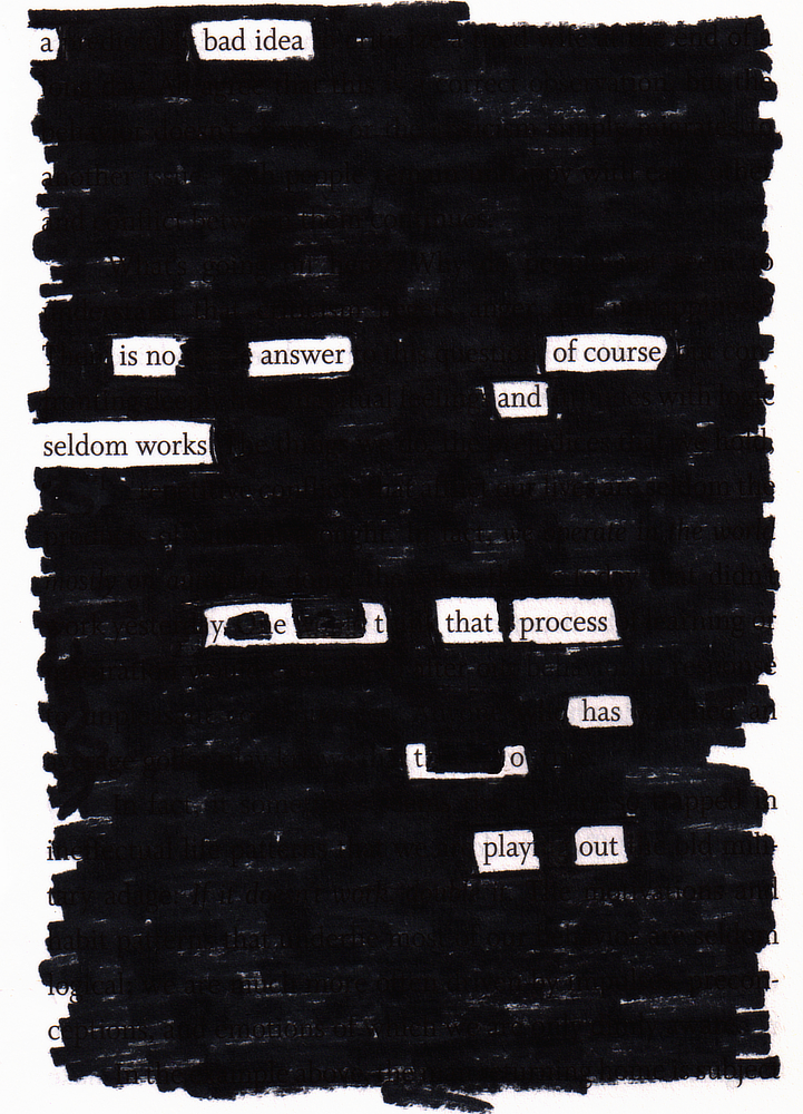 A Bad Idea September 19, 2022September 30, 2022 | Anna Cull Blackout poem #20 A bad idea is no answer Of course And seldom works Yet that process has to play out. Share this: Click to email a link to a friend (Opens in new window) Email Click to share on X (Opens in new window) X Click to share on Facebook (Opens in new window) Facebook Click to share on Pinterest (Opens in new window) Pinterest Like Loading... Related