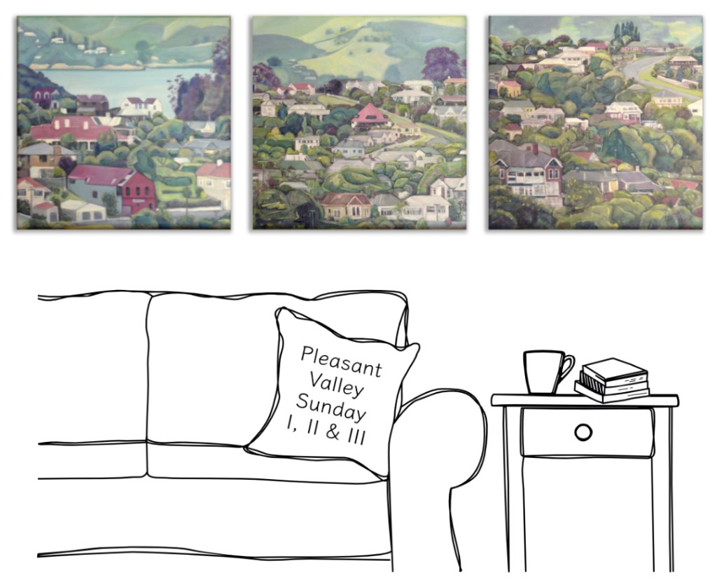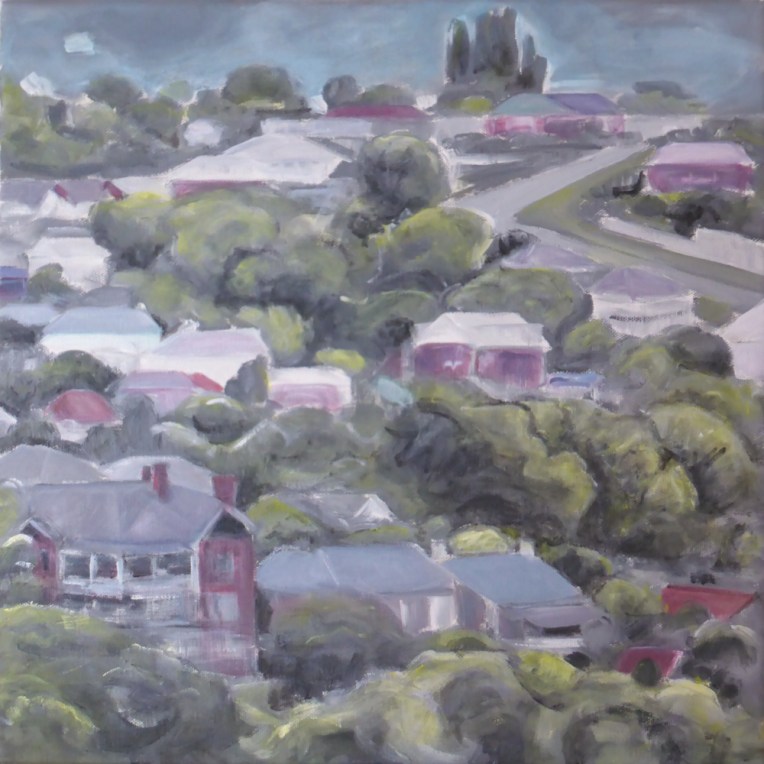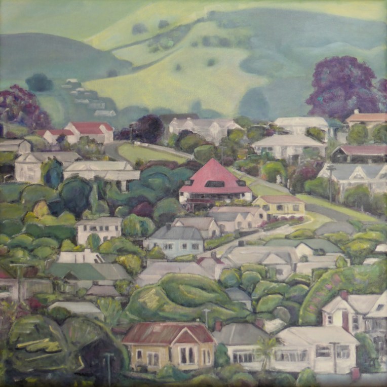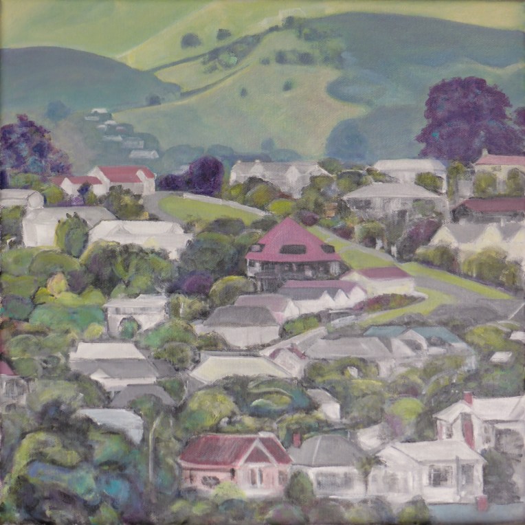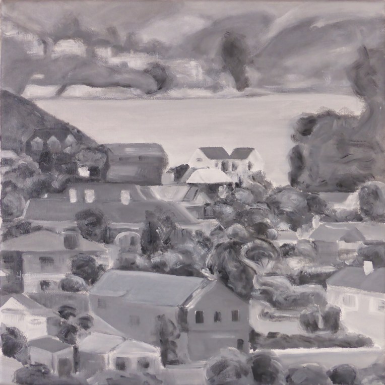 The Pleasant Valley Sundays were painted to exhibit at this year’s Pegasus Bay Art Show and are based on a view of Port Chalmers from the Lady Thorn Rhododendron Dell lookout on a misty summer’s day in 2017 (the photograph below).
