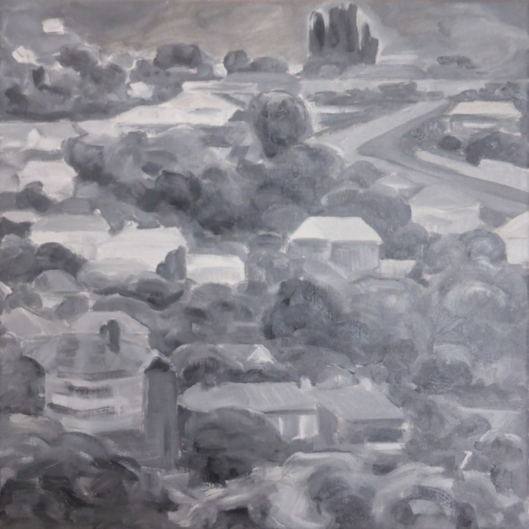 It took a little over six weeks (six weeks of actual painting time) to finish all three. A lot of thought went into finding a sort of architectural abstraction in the trees and also into limiting the amount of detail in the buildings so that the manmade appeared more organic and vice versa. If it hadn’t been for the deadline of the art show, I would probably still be painting them.