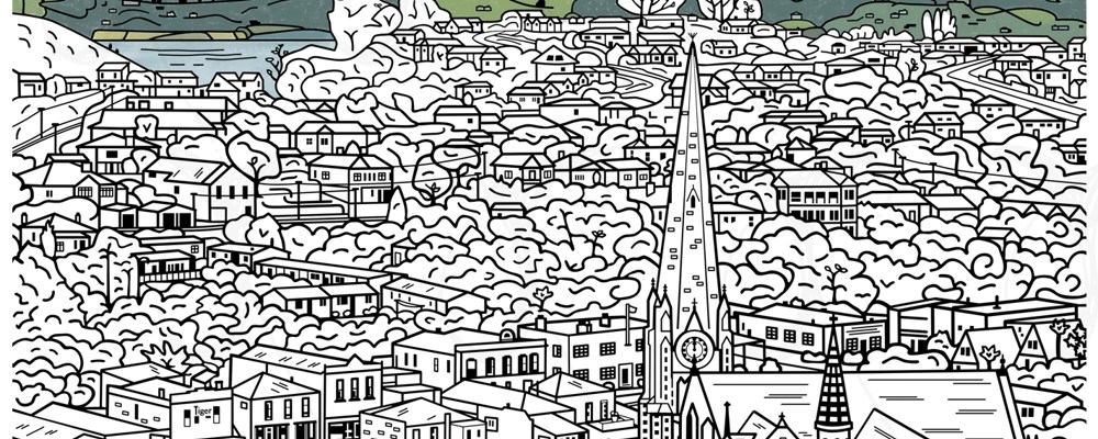I’m planning to do at least three New Zealand landscapes as colouring pages. My first page is based on a photograph of Port Chalmers with the historic Iona Church in the foreground and a large congregation of houses and trees in the surrounding neighbourhood. It may take a day or two (or three) to finish… and then it will be available via Etsy as a printable instant download.
