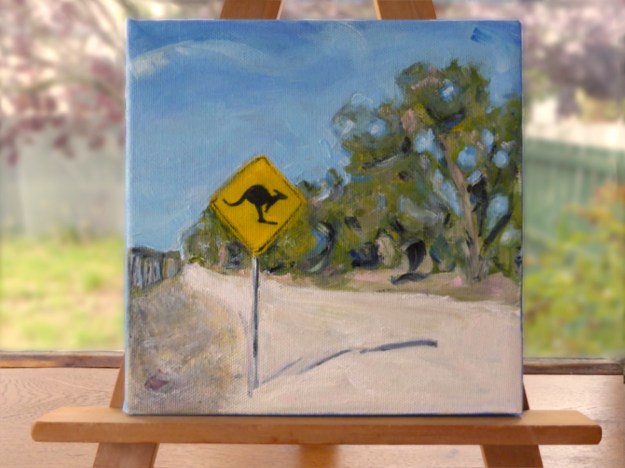 This little kangaroo road sign is officially one of my favourite paintings. Ever. I love the curves and the colours and the sign and the shadow falling across the road. I’m a bit tempted to keep this one… So if you are interested in buying it (and supporting a good cause), I suggest hopping over to my Etsy shop before I change my mind.