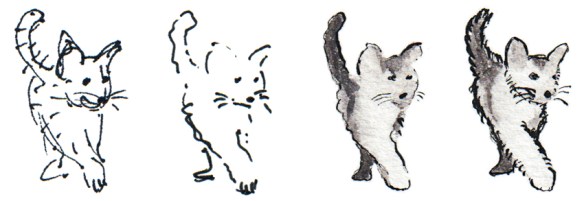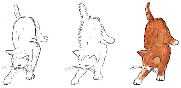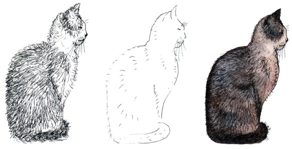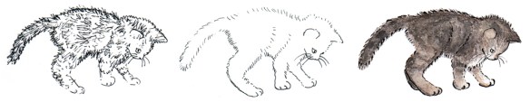 These WIPs show the transition of yesterday’s kitten sketch from the initial drawing through to the final image. I realise that the blown highlights make the kitten look a little odd ~ but because they are one of the reasons I like the photograph, I wanted to retain them in the sketch.