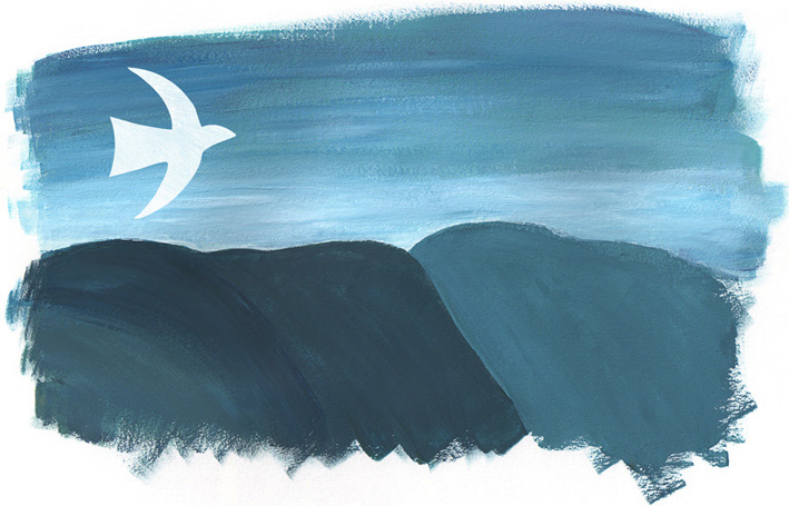 Of course I wanted to feature some of Rowena’s art in the design and the white bird is a recurring motif in her work. Rowena paints acrylic landscapes and seascapes (among other things) and also uses mosaic and collage techniques.