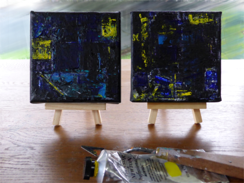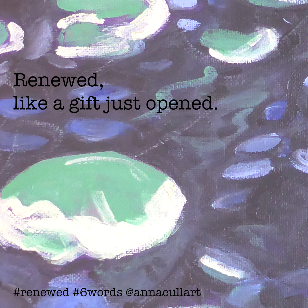 My latest six-word painting is more ‘rough art’ rather than fine art. It has lots of texture and touches of iridescent white and shiny gold (which aren’t really showing up in the photos). The nest wasn’t part of the original concept but just sort of appeared while I was working on the composition. Painting this reminded me that when I was very young, I wanted to sleep in the branches of our walnut tree, underneath the stars. Who am I kidding? I still do.