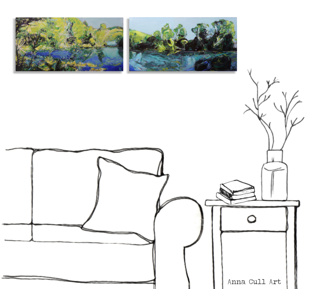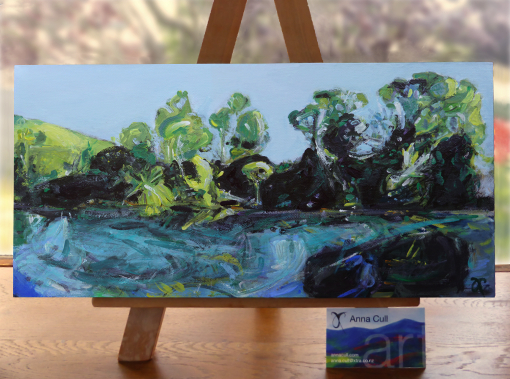 ‘Te Waikoropupū Springs I’ — acrylic on canvas, 205 x 405 mm, 2020. Available.