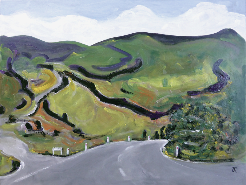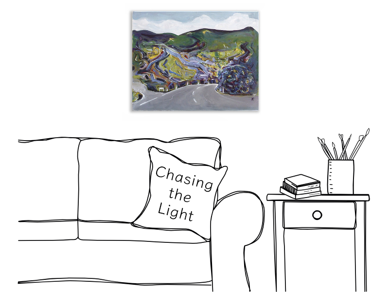‘Chasing the Light’ is an old painting that I’ve almost completely reworked ~ and it’s bonkers! Only the road and the sky are relatively untouched. I was spring cleaning the studio when I discovered this painting which I thought I’d already painted over. It used to go by the name of ‘Summer Roads’ (see below) and was painted in 2016. The subject and composition still appealed to me but I no longer liked the colours or tonal values, so I renamed it ‘Chasing the Light’ and painted over it, adding lines and highlights with acrylic paint markers (oh so much fun) and gold paint (probably not real gold) and even more paint.