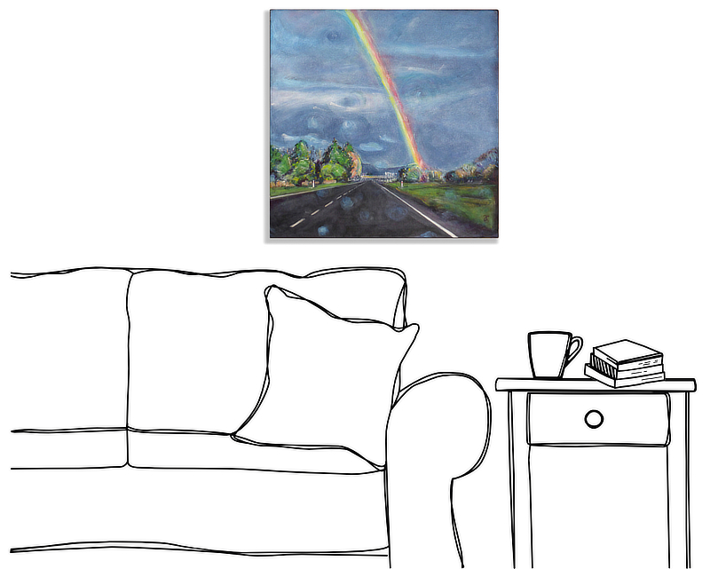 I have been thinking about painting this landscape for a little over six years. When I took the reference photo, the rainbow appeared to be shining directly into our neighbourhood, showing us the way home. I liked that : ) The only thing that made me reluctant to tackle it was also one of the things that made me want to paint it in the first place: the out-of-focus raindrops on the car windscreen. I wasn’t sure I could do what I had in mind ~ something representational but not too realistic. I needn’t have worried; the raindrops almost painted themselves (at least they look like raindrops to me). No, it was the painting of the rainbow that was the most difficult thing because I wanted to paint a rainbow that was not too ‘rainbowy’ (i.e. to paint a painterly painted rainbow and not an emoji 🌈 ).