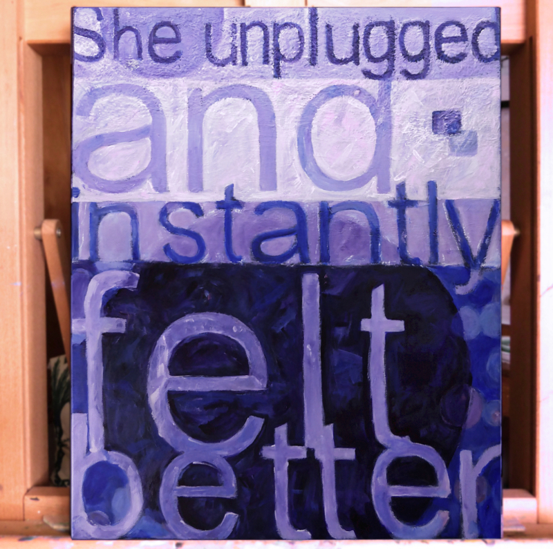 ‘Secrets kept her from being lonely’ is my latest six-word painting. It features (most of) a supermoon and many (many) layers of stars. It’s impossible to take a good photo of this painting now that it’s varnished and super glossy… and prior to varnishing, the colours weren’t nearly as rich and deep and dark. So what you see here will have to do. In real life, the moon and the stars are brighter than the blue text, and the night sky is blue, black, and purple. 🌕✨