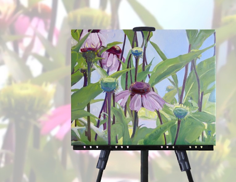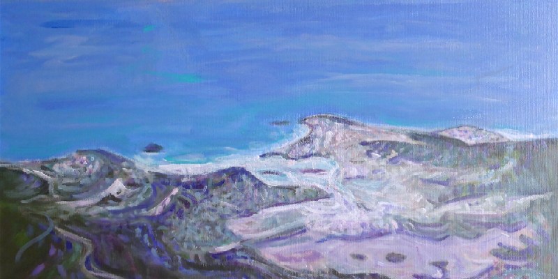 The work in progress photos show the painting from initial composition, through the refining of colour and exploration of patterns in the landscape to what I think may now be the finished painting. I’m going to leave it alone for a few days and then come back to it and see what I think.